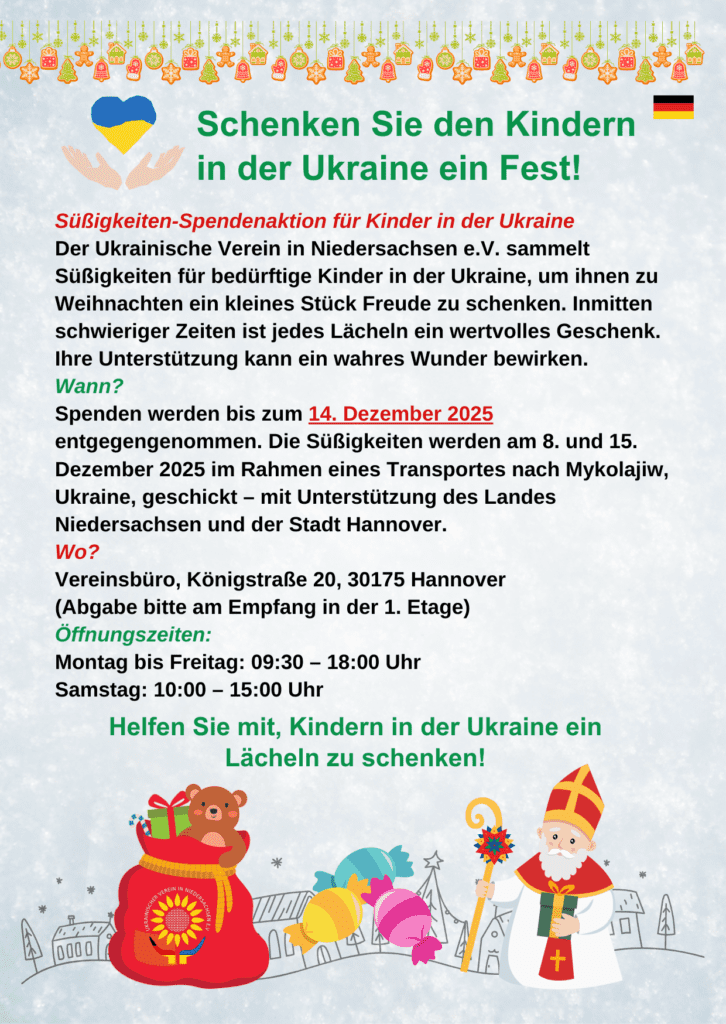 Der Ukrainische Verein in Niedersachsen e.V. sammelt Süßigkeiten für bedürftige Kinder in der Ukraine, um ihnen zu Weihnachten ein kleines Stück Freude zu schenken. Inmitten schwieriger Zeiten ist jedes Lächeln ein wertvolles Geschenk. Ihre Unterstützung kann ein wahres Wunder bewirken.