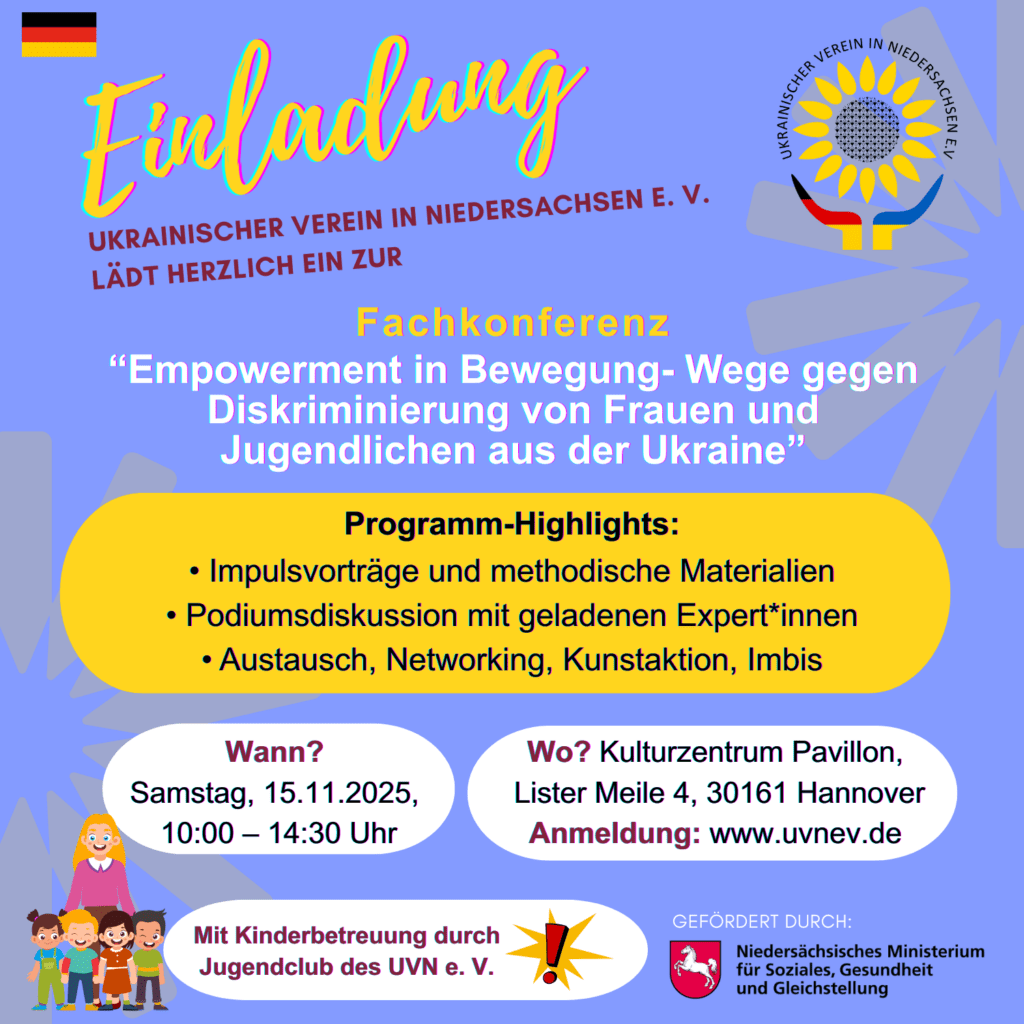 Der Ukrainische Verein in Niedersachsen e. V. lädt herzlich ein zu einem besonderen Fachtag, der sich dem Empowerment geflüchteter Frauen und Jugendlicher aus der Ukraine widmet.