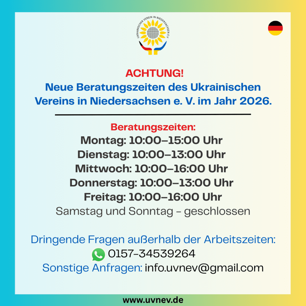 Wir informieren Sie über die neuen Beratungszeiten des Ukrainischen Vereins Niedersachsen im Jahr 2026.