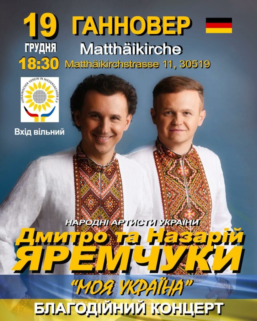 З великою радістю запрошуємо вас на різдвяний благодійний концерт народних артистів України Дмитра та Назарія Яремчуків! Вдруге вони приїздять до Ганновера, щоб подарувати нам свою неповторну українську музику та частинку святкового настрою.