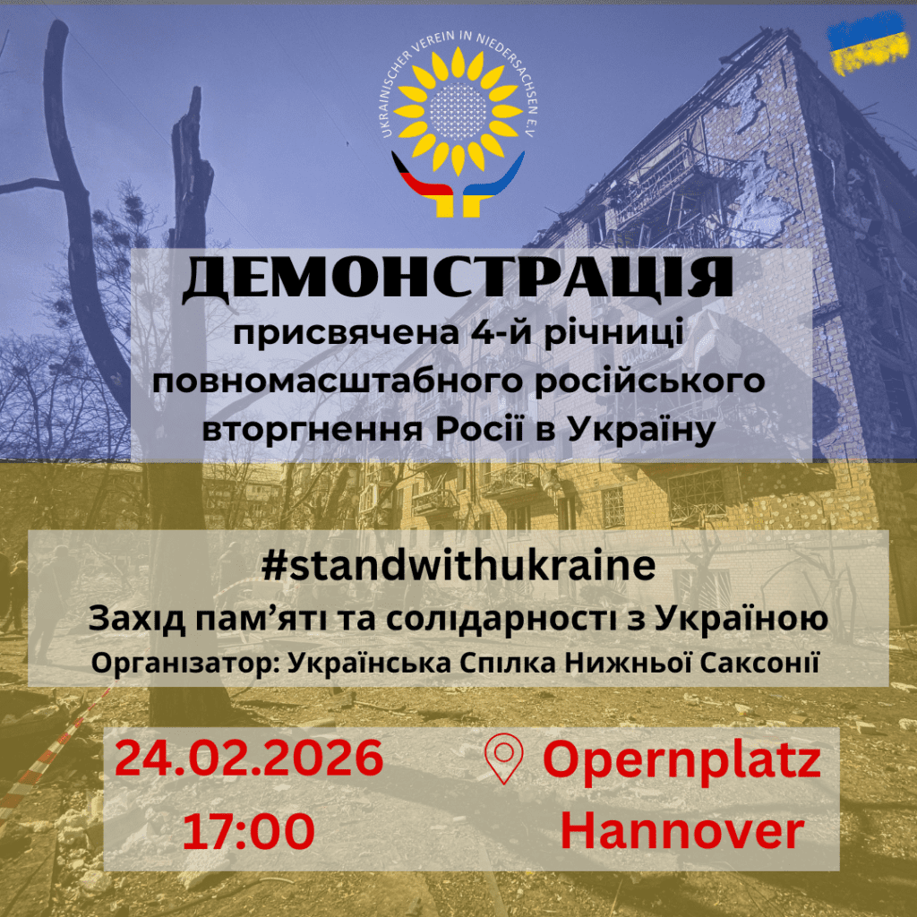 Разом ми — голос України в Ганновері. Разом покажемо підтримку нашій державі, яка щодня виборює свободу та право на майбутнє.